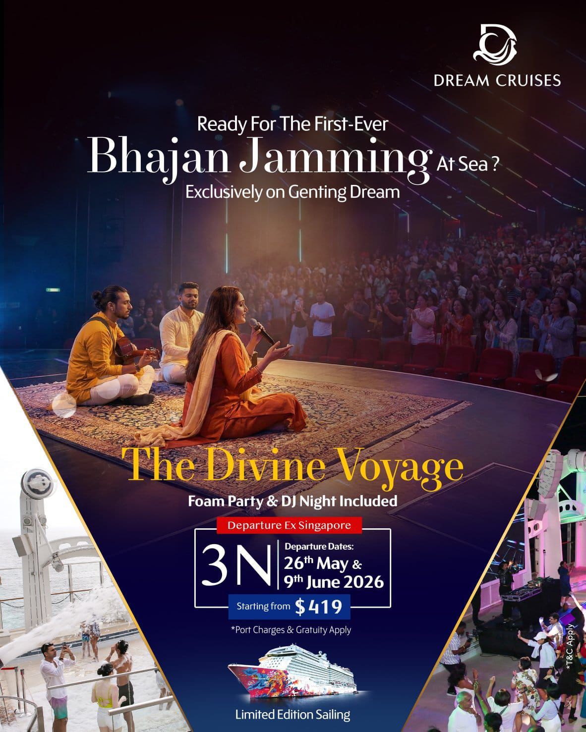As part of its themed sailings, the Genting Dream will host what is being positioned as the first-ever Bhajan Jamming session at sea. These special departures are scheduled for 26 May and 9 June 2026, featuring 3-night itineraries sailing from Singapore to Phuket and back.
